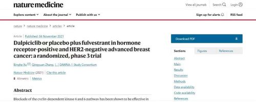近日,好体育app官网登录入口自主研发创新药达尔西利(Dalpiciclib,CDK4/6抑制剂)联合氟维司群治疗激素受体阳性HER2阴性晚期乳腺癌的3期临床研究(DAWNA-1)在国际顶级权威杂志《自然医学》(Nature Medicine,2021年影响因子:53.44)全文在线发表。这是继三种CDK4/6抑制剂的PALOMA、MONARCH、MONALEESA系列乳腺癌领域3期研究陆续发表于NEJM、Lancet Oncology、JCO等期刊后,又一新型分子结构的CDK4/6抑制剂(也是国内原研的首个CDK4/6抑制剂)的3期临床研究数据,再次登上顶尖医学期刊。
