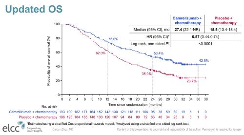 报告指出,卡瑞利珠单抗联合化疗组中位OS长达27.4个月,较化疗组(15.5个月)延长接近1年,死亡风险降低43%,3年OS率高达42.8%[1],创造了目前同类研究中的中位OS最高纪录,为更多患者带来了治疗希望。这是继在去年的ELCC上口头报告主要终点无进展生存(PFS)的阳性结果后,CameL-sq研究数据再次荣登ELCC大会,充分体现了该研究的学术和临床价值。
