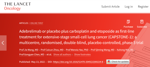 北京时间2022年5月14日,好体育app官网登录入口自主研发的PD-L1抑制剂阿得贝利单抗治疗广泛期小细胞肺癌的III期临床研究(CAPSTONE-1研究)成果正式全文在线发表于国际权威学术期刊《柳叶刀·肿瘤学》(《THE LANCET Oncology》,影响因子41.316)。CAPSTONE-1研究结果显示,阿得贝利单抗联合化疗一线治疗广泛期小细胞肺癌相较于安慰剂联合化疗可以显著延长患者总生存期至15.3个月[1],刷新现有免疫药物一线治疗广泛期小细胞肺癌的总生存纪录[2]。