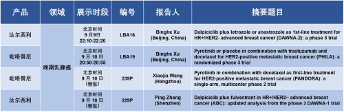 此外达尔西利和吡咯替尼还有2项研究入选壁报展示环节,分别为“吡咯替尼联合多西他赛一线治疗HER2阳性转移性乳腺癌的单臂、多中心II期研究(PANDORA研究)”及“达尔西利联合氟维司群治疗HR+/HER2-晚期乳腺癌(ABC):来自III期DAWNA-1研究的最新分析”。