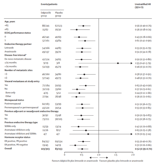 主要研究终点是研究者评估的PFS(预设单侧P≤0.0076为优效)。次要研究终点为盲法独立审查委员会(BIRC)评估的PFS、总生存(OS)、客观缓解率(ORR)、临床获益率(CBR)、缓解持续时间(DoR)和安全性。根据内脏转移(是vs否)、既往(新)辅助接受内分泌治疗(是vs否)和试验中联用何种非甾体类芳香化酶抑制剂(来曲唑vs阿那曲唑)对患者进行分层。