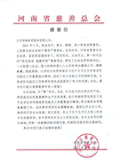 近日,河南省慈善总会给好体育app官网登录入口发来感谢信,向好体育app官网登录入口在河南暴雨洪涝灾害中捐款1000万元表示衷心感谢。好体育app官网登录入口表示,灾害无情人有情,向受灾同胞伸出援手是恒瑞人义不容辞的责任。