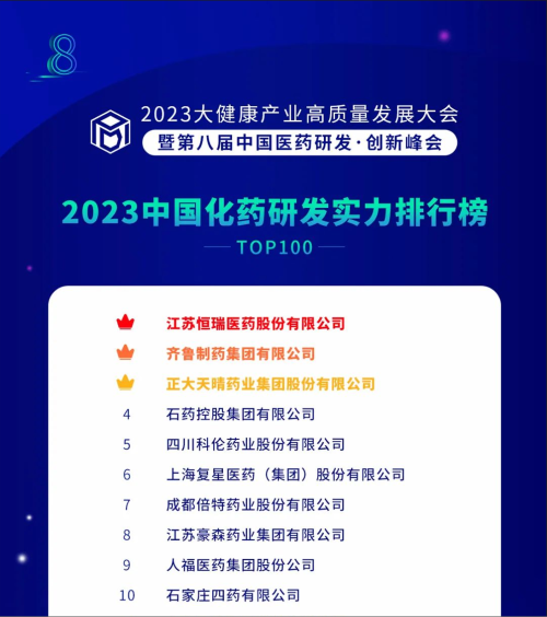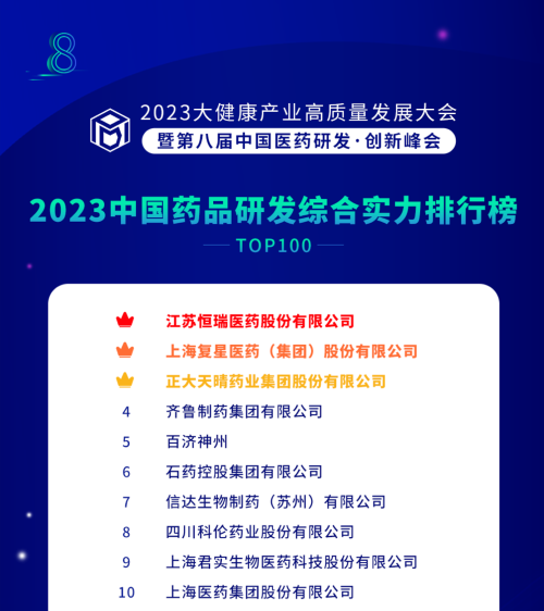 由药智网、中国药业杂志社主办的2023大健康产业高质量发展大会暨第八届中国医药研发•创新峰会于6月16日开幕,会上发布了《2023中国药品研发实力排行榜》系列榜单,好体育app官网登录入口凭借深厚的创新研发实力再创辉煌:荣登《2023中国药品研发综合实力排行榜TOP100》榜首、《2023中国化药研发实力排行榜TOP100》榜首。值得一提的是,今年是好体育app官网登录入口连续第6年入选《中国药品研发综合实力排行榜》榜首。