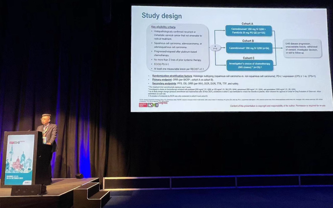有望为宫颈癌患者带来治疗新选择10月22日,好体育app官网登录入口创新药卡瑞利珠单抗联合法米替尼对比卡瑞利珠单抗单药或研究者选择的化疗治疗复发转移性宫颈癌随机、开放、对照、多中心的Ⅱ期临床研究(SHR-1210-Ⅱ-217) 亮相2023 ESMO大会简短口头报告现场3。该研究由复旦大学附属肿瘤医院吴小华教授团队开展,吴小华教授在现场公布了该重磅研究进展。研究结果显示,在既往以铂为基础化疗失败后复发或转移性宫颈癌患者中,与单独使用卡瑞利珠单抗或研究者选择的化疗相比,卡瑞利珠单抗联合法米替尼显著提高了抗肿瘤活性,安全性可控,有望为晚期宫颈癌患者提供新的治疗选择。