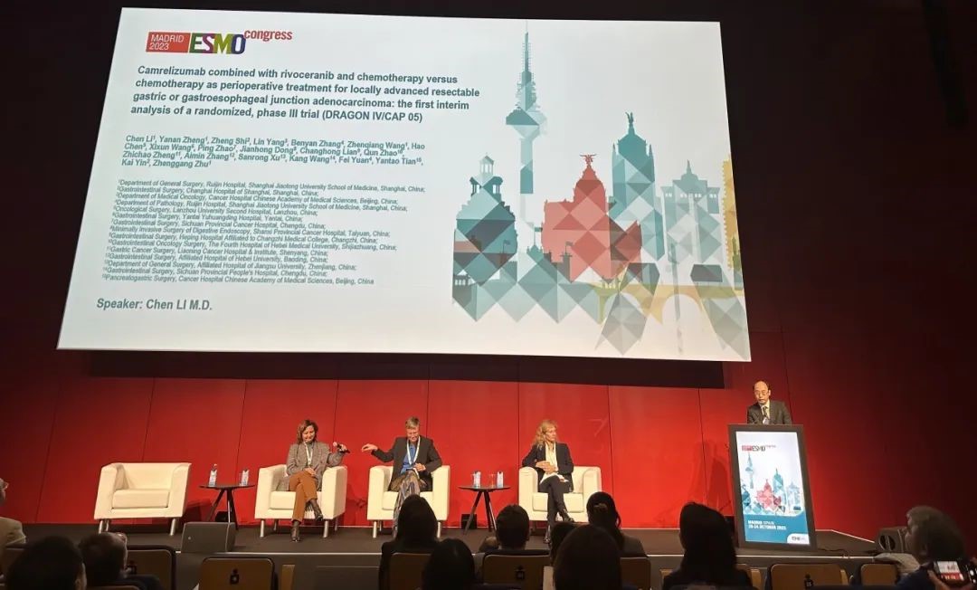10月21日,好体育app官网登录入口创新药卡瑞利珠单抗(艾瑞卡®)联合阿帕替尼(艾坦®)(“双艾”组合)和化疗对比化疗治疗局部进展期胃癌随机对照Ⅲ期试验(DRAGON-IV/AHEAD-G208研究)亮相2023 ESMO大会简短口头报告现场7。该研究由上海交通大学医学院附属瑞金医院朱正纲教授担任主要研究者,上海交通大学医学院附属瑞金医院的李琛教授在现场公布了研究进展。该研究是全球首个评估围手术期免疫联合抗血管生成药物和化疗治疗可切除胃癌或胃食管结合部腺癌的III期临床试验,结果显示,卡瑞利珠单抗联合阿帕替尼和化疗组病理完全缓解(pCR)率18.3%,显著高于化疗组的5.0%,p<0.0001;同时,在化疗基础上加卡瑞利珠单抗和低剂量阿帕替尼,安全性可控,且未影响手术可行性。该研究结果证明,卡瑞利珠单抗联合阿帕替尼和化疗为可切除胃癌和胃食管结合部腺癌患者围术期治疗提供了新选择,为其在胃癌领域的治疗再添力证!