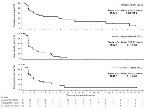 该I期研究(NCT03774979)分为剂量递增和剂量扩展2部分试验,随后在不同肿瘤类型、基因突变或既往经治的多个队列中进行临床扩展研究。本次ESMO ASIA大会中展示了3个NSCLC临床扩展队列的结果。队列1纳入未接受全身化疗,PD-L1 TPS≥1%的患者;队列2纳入既往接受至少一线EGFR TKI标准治疗失败的EGFR敏感突变患者,接受标准治疗耐药或没有有效标准治疗的方案的EGFR突变患者;队列3纳入既往接受抗PD-1/PD-L1单抗治疗后进展且最多接受3线治疗的患者。符合条件的患者给予SHR-1701 30 mg/kg,每3周1次。主要终点为客观缓解率ORR(RECIST v1.1)。次要终点为安全性、最大耐受剂量(MTD)及II期推荐剂量(RP2D)。
