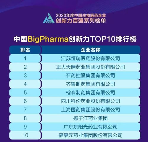 好体育app官网登录入口登顶“中国BigPharma企业创新力TOP10排行榜”