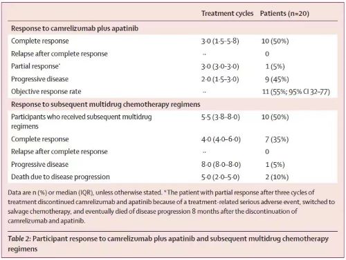 从安全性来看,卡瑞利珠单抗联合阿帕替尼方案安全可耐受,最常见的3级治疗相关不良事件为高血压(5例,25%)、皮疹(4例,20%)、中性粒细胞计数减少(2例,10%)、白细胞计数减少(2例,10%)和天冬氨酸转氨酶升高(2例,10%)。一例患者发生了治疗相关严重不良事件(天冬氨酸转氨酶高于正常上限19倍)导致住院。没有4级或5级治疗相关不良事件发生。
