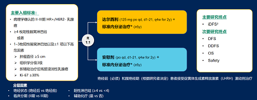 达尔西利(Dalpiciclib)是好体育app官网登录入口自主研发的口服、选择性的小分子CDK4/6抑制剂,也是中国首个自主研发的新型高选择性 CDK4/6 抑制剂,已证实其与内分泌治疗(ET)联合用于 HR+/HER2- 晚期乳腺癌的一线和后线治疗时,均显著改善无进展生存期(PFS)6,7。因此开展了一项随机、双盲、III期临床试验(DAWNA-A),以进一步评估达尔西利联合内分泌治疗作为高危早期 HR+/HER2 - 乳腺癌辅助治疗的效果。本研究纳入高危复发风险人群需满足以下标准之一:①≥4 枚阳性腋窝淋巴结;②1–3枚阳性腋窝淋巴结且合并≥1 项高危因素(肿瘤直径 ≥5 cm,组织学分级3级,辅助治疗后残留浸润性乳腺癌,Ki-67 ≥30%)。本文呈现预先设定的首次中期分析(IA1)结果。