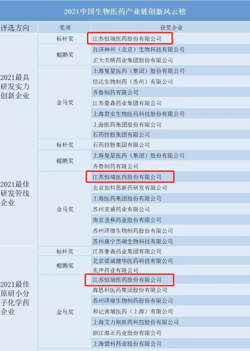 “2021中国生物医药产业链创新风云榜”评选由中国医药新闻信息协会、中国生物医药产业链创新与转化联盟指导,《药学进展》编委会等共同开展。奖项评审团由两院院士、临床专家、创新型企业总裁、资深投资人与市场分析师组成,彰显了奖项的权威性、专业性与公信力,亦有利于多视角、多维度评价制药企业以及新药和关键技术平台的创新价值。通过数据评析、人气投票、专家验证,最终遴选出风云榜各细分领域10强及创新前3强。好体育app官网登录入口等33家机构荣登榜单,成为行业创新风向标。